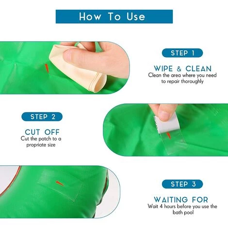 Simple Ă utiliser : dĂ©coupez Ă la taille et Ă la forme, nettoyez et sĂ©chez les surfaces gonflables endommagĂ©es pour Ă©viter que la poussière et les liquides n’affectent l’adhĂ©rence de la rĂ©paration, dĂ©collez le film transparent Ă l’arrière, appliquez sur une surface lisse et plane, appuyez et attendez 30 utilisations, après quelques minutes. Veillez Ă ne pas crĂ©er de bulles d’air lors du collage, sinon cela affectera l’effet impermĂ©able et gonflable.