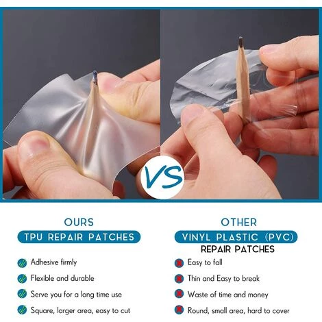 Patch de rĂ©paration de piscine pratique: le patch en TPU transparent est largement utilisĂ©, peut rĂ©parer des tentes, des parapluies, des impermĂ©ables, des tentes gonflables, des coussins d’air, des anneaux de natation, des piscines gonflables, des sacs secs et d’autres produits gonflables. Après la rĂ©paration, cela n’affectera en rien l’utilisation normale, rĂ©pondez